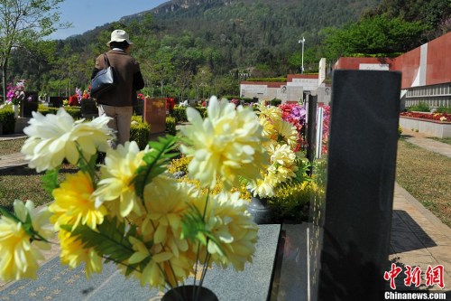 資料圖:昆明一墓園內(nèi)的墓碑上插滿鮮花。任東 攝
