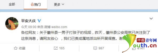 中國青年網(wǎng)北京4月1日電(記者 李永鵬 見習(xí)記者 劉利影)近日,一段男子不斷掌摑、毆打女童的視頻在網(wǎng)上流傳,引發(fā)網(wǎng)民關(guān)注。有網(wǎng)友稱,視頻拍攝地為大慶市肇州縣。4月1日上午9時(shí),大慶市公安局官方微博發(fā)布消息稱,肇州縣公安局已關(guān)注到相關(guān)視頻,并責(zé)成屬地派出所開展調(diào)查。