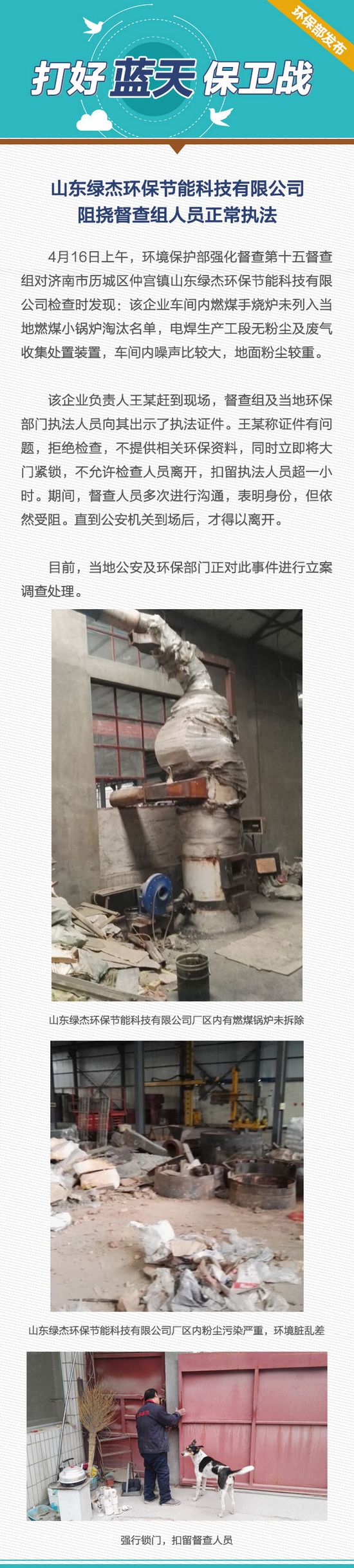 中國網(wǎng)4月16日訊 據(jù)環(huán)境保護部宣傳教育司官方微博消息,4月16日上午,環(huán)境保護部強化督查山東省濟南市督查組在對山東綠杰環(huán)保節(jié)能科技有限公司正常檢查執(zhí)法時受阻,并被非法扣留。目前當?shù)毓布碍h(huán)保部門正對此事進行立案調(diào)查處理。