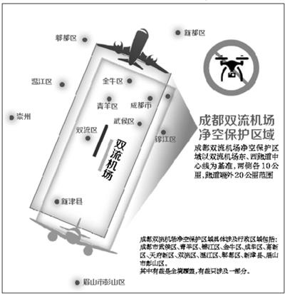 民航空中管制部門工作人員告訴北青報(bào)記者,成都雙流機(jī)場凈空保護(hù)區(qū)域是以成都雙流國際機(jī)場東、西跑道中心線為基準(zhǔn),兩側(cè)各10公里,跑道端外20公里的范圍來劃定的。具體包括下列行政區(qū)域:成都市武侯區(qū)、青羊區(qū)、錦江區(qū)、金牛區(qū)、成華區(qū)、高新區(qū)、天府新區(qū)、雙流區(qū)、溫江區(qū)、郫縣、新津縣、眉山市彭山區(qū)。