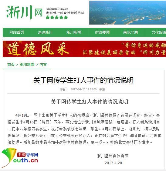 說明介紹說, 4月19日,網上出現(xiàn)關于學生打人視頻后,淅川縣教體局連夜展開調查。經查,事情發(fā)生于4月16日(周日)下午,事發(fā)地位于淅川縣城新建路一巷道里,打人者系淅川縣一初中八年級四名學生,被打者系該校七年級一學生。4月20日早上,淅川縣一初中及時將情況上報公安機關。目前,公安機關已經介入,正在對涉事學生進行調查取證,并將依法處理。淅川縣教體局將加強對學生教育管理,舉一反三,杜絕此類事情再次發(fā)生。