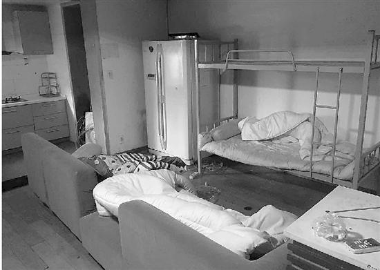 客廳內(nèi)有多張拆下來的床板;客廳放置了布藝的沙發(fā),沙發(fā)上還有兩床被子,看跡象是住過人的;旁邊是一張高低鋪床,臺子上還有塑料袋包裹著發(fā)出惡臭的茶葉蛋殼。