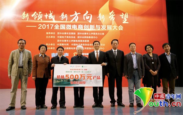 團中央“青年之聲”微電商服務(wù)聯(lián)盟副主席、海名微微電商平臺總裁、新西蘭紐西之謎中國區(qū)首席代表劉曉坤(左五)向北京授漁計劃公益促進中心捐贈海名微公司價值500萬元產(chǎn)品,授漁計劃公益促進中心秘書長高繼輝(左三)接受捐贈。左四為十一屆全國人大常委會副委員長周鐵農(nóng)。中國青年網(wǎng)記者李鐵攝