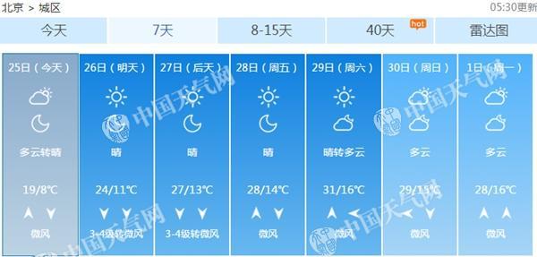 今天北京氣溫有所下降,為近期氣溫最低的一天。北京氣象臺預計,今天白天多云轉(zhuǎn)晴,最高氣溫19℃;夜間晴,最低氣溫8℃。不過本周晴暖天氣是主線,明天起氣溫將日漸攀升,周六有望再次迎來30℃+。