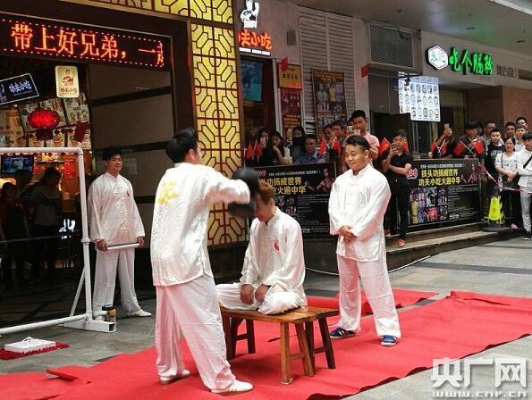 央廣網(wǎng)深圳4月29日消息(記者 于揚(yáng))在深圳真有鐵頭功!而且這位高手就藏在深圳的東門,他可以倒立在一根堅(jiān)硬的鐵釘上數(shù)十分鐘,他就是鄭衛(wèi)勇。在之前香港舉行的“感恩杯”第十屆香港國際武術(shù)大賽上,他表演頭頂鐵釘?shù)沽ⅲA(yù)計(jì)表演80分鐘,但第40分鐘時(shí),裁判員已經(jīng)激動(dòng)地宣布他獲得了冠軍!記者近日也用鏡頭紀(jì)錄了他令人咋舌的“功力”——倒立在一根堅(jiān)硬的鐵釘上,頭部把釘在木板上的鐵釘壓彎!