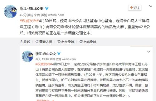 今日下午浙江舟山市公安局官方微博發(fā)布消息稱,4月30日晚,經(jīng)舟山市公安司法鑒定中心鑒定,定海長白島太平洋海洋工程(舟山)有限公司維修外輪船體底部容器內(nèi)的物品為大麻,重量為42.5公斤。