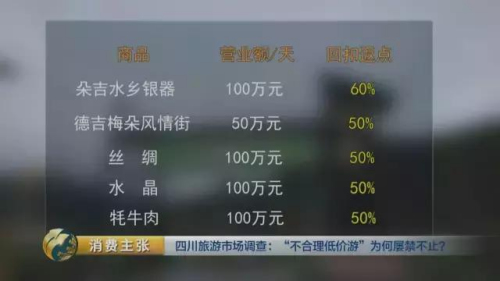 2016年11月,央視財(cái)經(jīng)《消費(fèi)主張》欄目報(bào)道了四川省旅游亂象,在四川一些景區(qū),旅行社和購(gòu)物商店勾結(jié),旅游購(gòu)物回扣現(xiàn)象非常普遍,銀器回扣高達(dá)60%,其他水晶、絲綢、牦牛肉的回扣也高達(dá)50%。