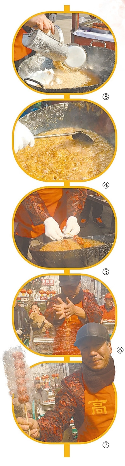 糖漿停當后,將鍋傾斜,拿著串好的糖球在鍋中一轉(zhuǎn),順勢提起將其“倒立”,兩只手掌夾緊竹簽一轉(zhuǎn),新出鍋的糖漿在空中一甩,便成了晶瑩的細絲凝固下來,火紅的糖球變戲法似的“開了花”,包裹在一層晶瑩剔透的白色之中,一抹紅色在其中隱隱約約,美其名曰“雪里紅”,此系高家獨創(chuàng)制作技藝。