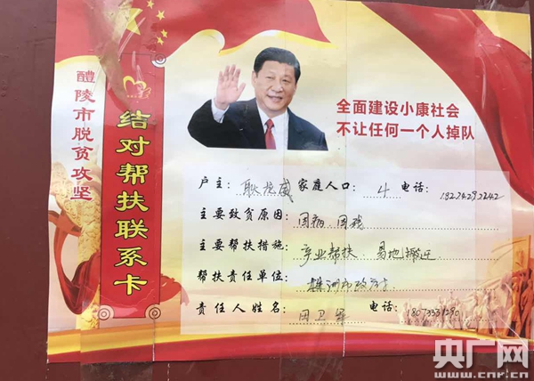 看到記者來采訪,耿龍威的妻子顯得很高興,熱情地倒茶洗水果。很顯然,她對即將住進(jìn)的新房充滿了期待,看到她走路有些顛簸,村委會的干部告訴記者,她其實腿腳不便,家里的門上貼著的幫扶聯(lián)系卡上寫的也是因病、因殘致貧。