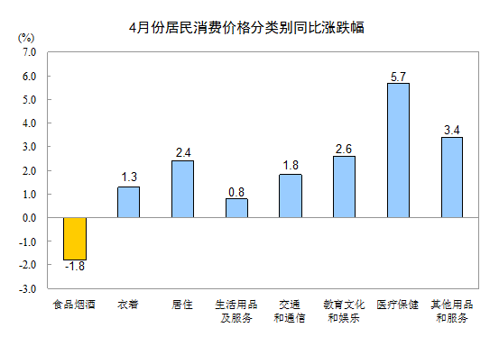 4月份,食品煙酒價(jià)格同比下降1.8%,影響CPI下降約0.56個(gè)百分點(diǎn)。其中,鮮菜價(jià)格下降21.6%,影響CPI下降約0.65個(gè)百分點(diǎn);蛋價(jià)格下降11.4%,影響CPI下降約0.07個(gè)百分點(diǎn);畜肉類價(jià)格下降4.6%,影響CPI下降約0.23個(gè)百分點(diǎn)(豬肉價(jià)格下降8.1%,影響CPI下降約0.24個(gè)百分點(diǎn));水產(chǎn)品價(jià)格上漲5.9%,影響CPI上漲約0.11個(gè)百分點(diǎn);鮮果價(jià)格上漲5.9%,影響CPI上漲約0.10個(gè)百分點(diǎn);糧食價(jià)格上漲1.5%,影響CPI上漲約0.03個(gè)百分點(diǎn)。