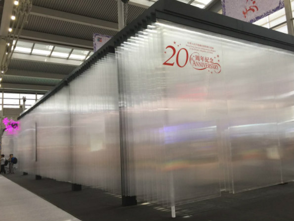 香港館的整體建筑設計是躺臥著的一棟大廈,99片略帶透明的PC板將整個展館分隔成“九十九層樓”。正面看是一個封閉的空間,側(cè)面看則是內(nèi)里連通著外部世界,寓意著從不同的角度看世界會有不同的發(fā)現(xiàn)