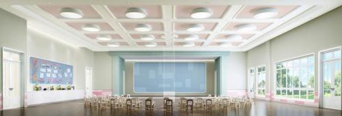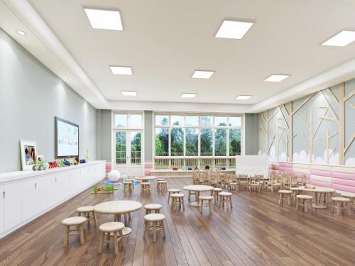 園內(nèi)普通教室均有落地飄窗,保證通透采光,與近水走廊相連,課堂上能觀賞對岸風(fēng)光;專項教室涵蓋閱覽、音樂、烹飪、美工、科學(xué)等各類課程,為孩子們營造充足的活動空間;戶外區(qū)域面積達二十多畝,以樟樹為主打造森林氛圍,其獨有的水塘能提供水生自然的學(xué)習(xí)資源,另設(shè)種植、養(yǎng)殖區(qū)塊,在天然的稻田中能與小動物相互親近。