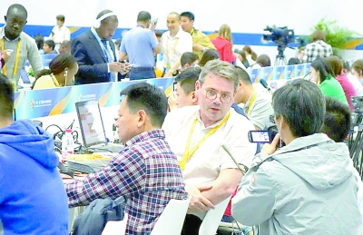 高峰論壇期間,媒體同行之間相互采訪,交流報道心得和對論壇的印象。光明日報記者 郭紅松攝/光明圖片