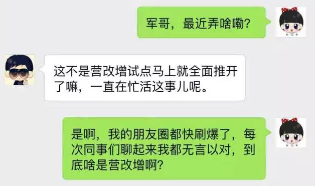到今年5月1日,營(yíng)改增試點(diǎn)全面推開(kāi)已整整一年。一年來(lái),營(yíng)改增減稅效應(yīng)如何?今后又如何深入推進(jìn)這項(xiàng)改革?一無(wú)所知的小白又來(lái)請(qǐng)教稅務(wù)達(dá)人小軍了!一起看看他們又聊了啥?