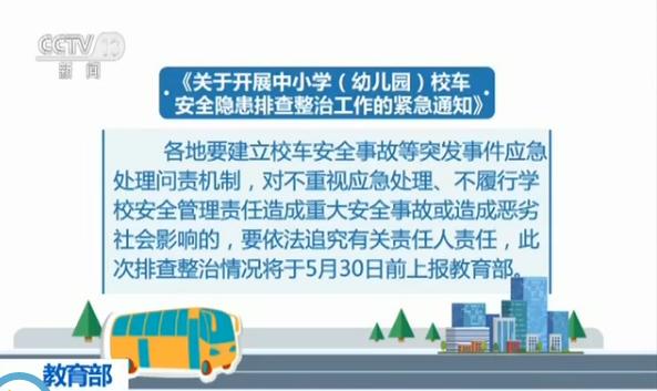 《通知》還明確,各地要建立校車安全事故等突發(fā)事件應急處理問責機制,對不重視應急處理、不履行學校安全管理責任造成重大安全事故或造成惡劣社會影響的,要依法追究有關責任人責任,并將排查整治情況于5月30日前上報教育部。