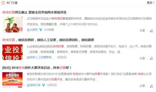 求贊拉票本來是在拼人氣,但也成為一些人的煩惱。為了在“票”數(shù)上一決雌雄,求贊票者不遺余力,撒錢拉人獎品引誘,各顯其能。對于接受“點贊”任務(wù)的朋友們,礙于情面,不論事實怎樣,動動拇指做個順?biāo)饲,但時間久了,也是惹人煩、不勝其擾?梢哉f,求贊拉票已經(jīng)為朋友圈一大累贅,一大負擔(dān)。更令人匪夷所思的是,“刷票”,不僅在比實力,拼人脈,還可以搞“產(chǎn)業(yè)”。在網(wǎng)上搜索“微信投票”,很快就能出現(xiàn)“微信人工刷票”“微信投票群”“微信投票團隊”等收費刷票的信息,可見其背后潛藏著的利益鏈條。