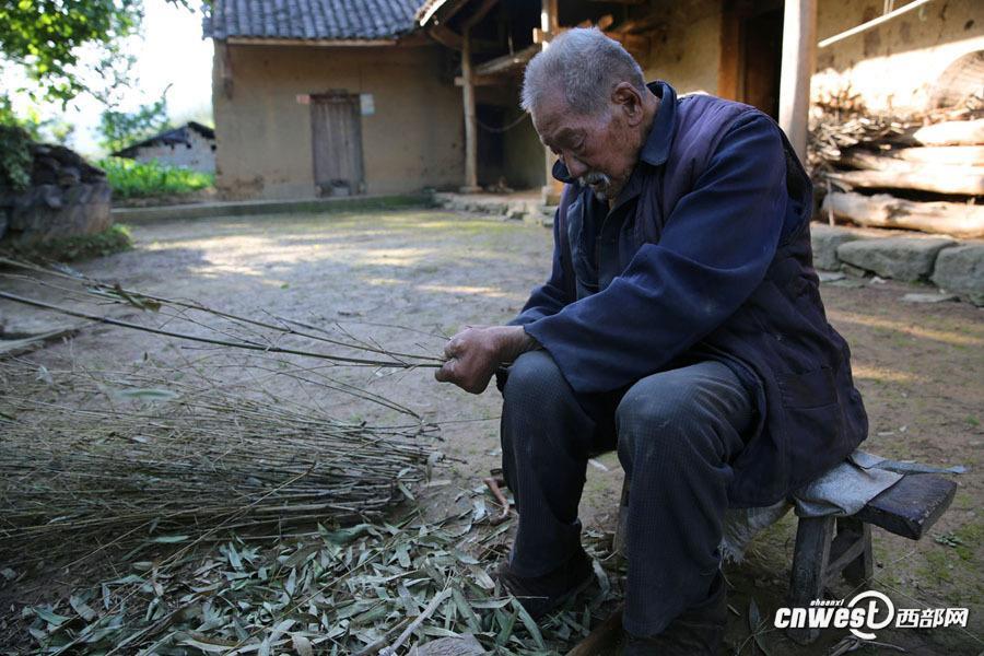5月23日,陜西省漢中市寧強縣鐵鎖關鎮(zhèn)周家坎村半山腰上,106歲的老壽星王春云在土坯房前將一根根竹枝上的葉子摘掉擺放整齊準備綁掃把。(記者 魏永賢)圖片來源:西部網