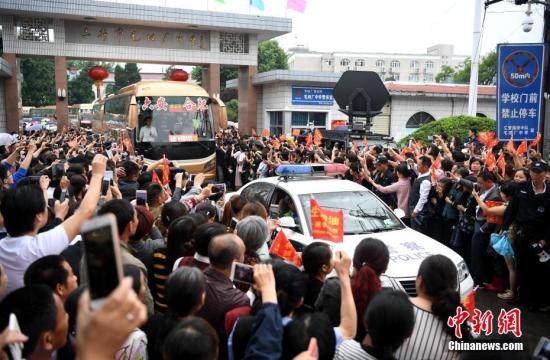 6月5日上午,安徽毛坦廠中學(xué)考生出發(fā),萬余民眾冒雨相送。8時(shí)08分,28輛大巴車從毛坦廠校園緩緩開出,毛坦廠鎮(zhèn)過萬民眾夾道歡送。 中新社記者 韓蘇原 攝