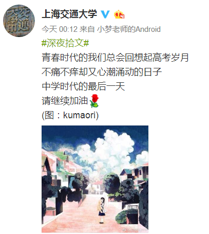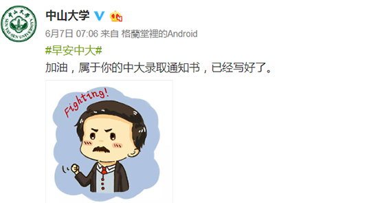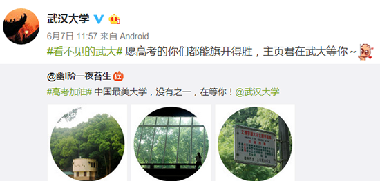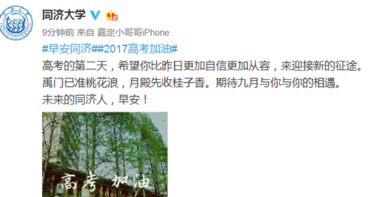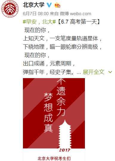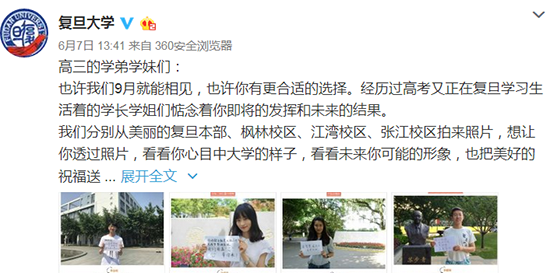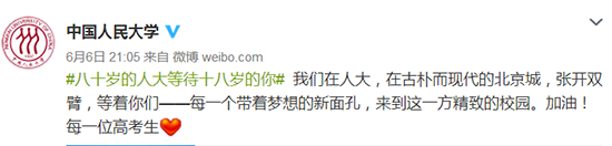 人民網北京6月8日電 一年一度的高考鐘聲已于昨日再次在全國各地敲響,940萬考生在火熱的六月迎戰(zhàn)生命中一場重要的考驗。值此之際,北京大學、人民大學、復旦大學、武漢大學等高校紛紛通過官方微博為高考考生獻上祝福和鼓勵:愿你沉著自信奔赴戰(zhàn)場,祝你旗開得勝金榜題名,我們在大學等你!