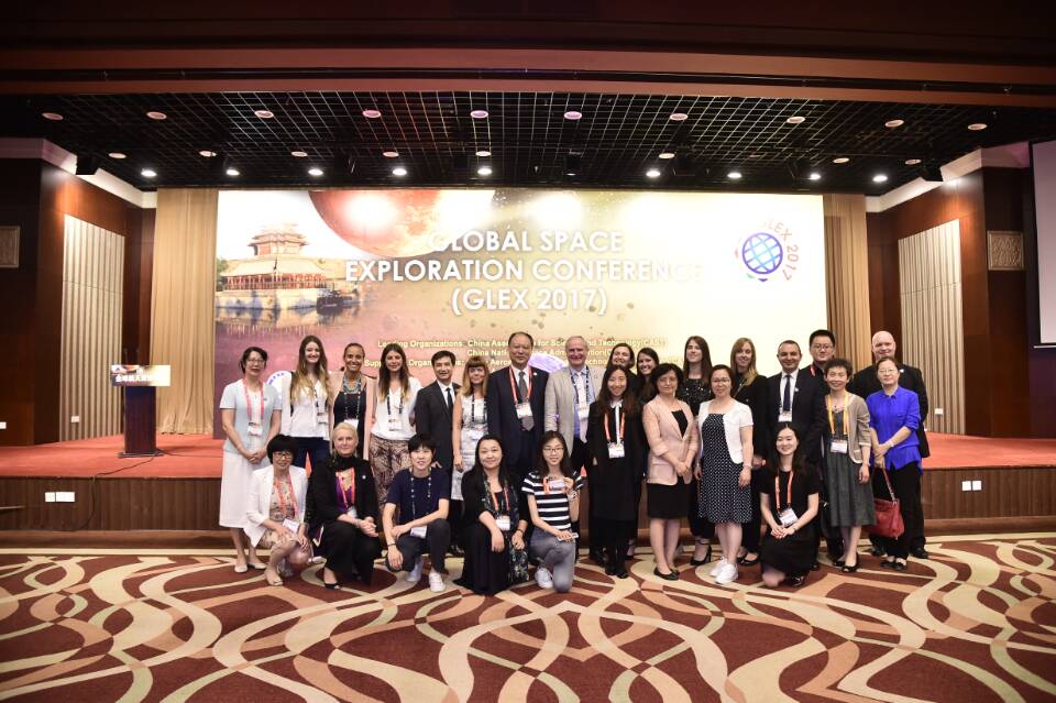 備受關(guān)注的2017年全球航天探索大會(huì)8日在京落下帷幕,與會(huì)代表們在主會(huì)場合影留念。