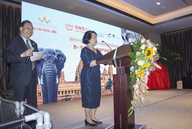 柬埔寨王國駐華大使館KHEK/MCAIMEALY女士、河南旅游局副局長周耀霞女士應邀出席并作了熱情洋溢的講話。出席本次發(fā)布會的還有鄭州市旅游局副局長李明偉、柬埔寨K6吳哥航空公司商務代表黎嘉嘉、北京美嘉環(huán)球國際旅行社有限責任公司董事長周旭東以及河南省各知名旅行社負責人。