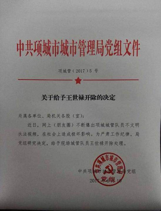該視頻發(fā)出后,項(xiàng)城市城市管理局領(lǐng)導(dǎo)高度重視,立即成立了由紀(jì)檢組長(zhǎng)牽頭的調(diào)查組,對(duì)該事件進(jìn)行全面深入調(diào)查。6月10日,該局黨組會(huì)作出對(duì)城管隊(duì)員王某開除處理的決定。(完)