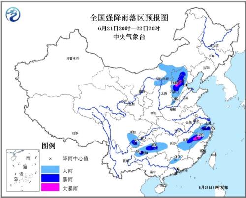 中央氣象臺6月21日18時發(fā)布暴雨黃色預警:預計,6月21日20時至22日20時,山西北部、河北大部、北京、天津西部、內(nèi)蒙古中部偏南等地的部分地區(qū)有大到暴雨,其中北京西南部、河北中部等地局地有大暴雨(100~140毫米)。