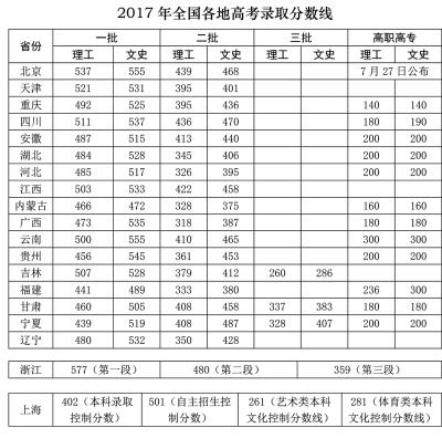 2017年全國(guó)部分地區(qū)高考錄取分?jǐn)?shù)線