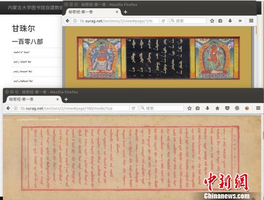 圖為1720年御制北京木刻版蒙古文《甘珠爾》經的數(shù)字化成果,先登錄內蒙古大學蒙古文數(shù)字圖書館即可查看!让晒糯髮W圖書館 攝