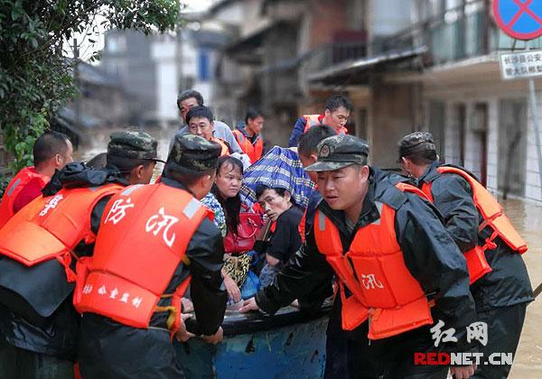 下午14時,長沙縣榔梨街道陶公廟再傳險情,數(shù)百名群眾被困在居民樓內(nèi)。長沙支隊200余名前線救災官兵駕駛沖鋒舟前往受災最嚴重的地區(qū),挨家挨戶進行搜救,成功將300余名被困群眾轉(zhuǎn)移到安全區(qū)域。18時30分,前方傳來最新消息,瀏陽河朗梨站水位到達歷史最高水位,烏山鎮(zhèn)團山湖發(fā)生湖水漫堤險情,長沙支隊再次出動150名兵力緊急增援。目前,該支隊已在此地奮戰(zhàn)一天一夜,累計轉(zhuǎn)移2000余名群眾。“武警官兵來了,我們就放心了!”在雨中已持續(xù)奮戰(zhàn)一天總隊近兩千余名官兵將繼續(xù)堅守一線,最大限度降低暴雨所帶來的損失,不負省委省政府和駐地群眾的重托。