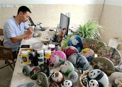 來到犍為后,郝壯到了一家機(jī)械廠工作。上班之余,他把主要精力都放在了美術(shù)學(xué)習(xí)上。有一天,他來到岷江河邊散心,一塊樣式奇特的鵝卵石吸引了他的注意力!霸谑^上畫出來的作品,肯定很特別吧?”在郝壯看來,石頭容易保存,又不需要花錢買,可以一試。、