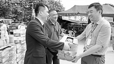 昨天,全國(guó)勞模、省市道德模范甘金華(中)攜武漢藍(lán)天龍韻大飯店總經(jīng)理陳匯(左)、闖王餐飲管理有限公司等眾多愛(ài)心企業(yè),來(lái)到四唯碼頭附近江堤,為駐守在那里的二七街防汛應(yīng)急指揮部送去礦泉水、西瓜、方便面等價(jià)值數(shù)萬(wàn)元的物資。