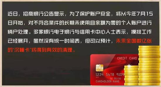 招商銀行近日的公告顯示,為保護(hù)賬戶安全,將從7月15日開始,對長期未使用且余額為零的賬戶進(jìn)行銷戶。多家銀行也表示,類似主題的摸排工作已展開,預(yù)計(jì)全國數(shù)億張沉睡卡將得到有效清理。你手上有這樣的卡嗎?該如何處置?