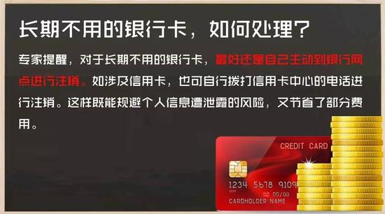 銀行工作人員建議,消費(fèi)者對手上的銀行卡需及時分類處置、妥善保管。對于確實(shí)不再需要使用的銀行卡或存折,可到銀行辦理銷戶處理。