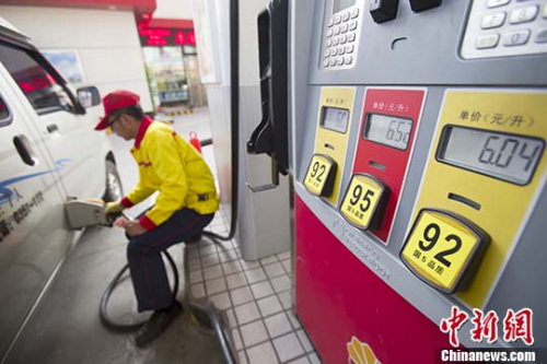資料圖:山西太原,加油站工作人員給車(chē)輛加油。 中新社記者 張?jiān)?攝