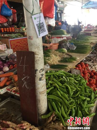 圖為燎源菜市的蔬菜攤位上方懸掛著收款二維碼。 周瀟男 攝