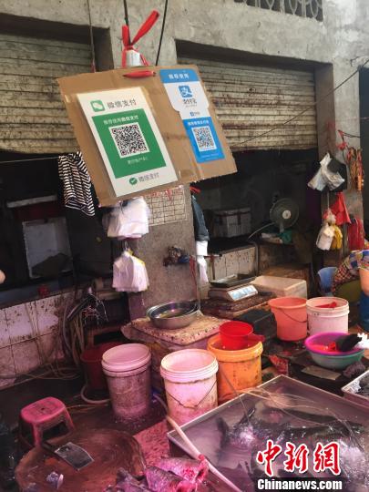 圖為燎源菜市的魚(yú)攤位上方懸掛著收款二維碼!≈転t男 攝