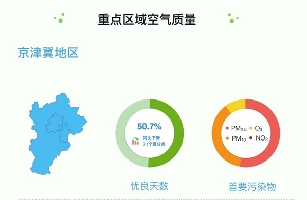 京津冀區(qū)域問(wèn)題尤其突出,上半年平均優(yōu)良天數(shù)比例為50.7%,同比下降7.1個(gè)百分點(diǎn)。PM2.5濃度為72微克/立方米,同比上升14.3%;PM10濃度為129微克/立方米,同比上升13.2%。北京市上半年平均優(yōu)良天數(shù)比例為55.3%,同比下降5.8個(gè)百分點(diǎn)。PM2.5濃度為66微克/立方米,同比上升3.1%;PM10濃度為96微克/立方米,同比上升15.7%。