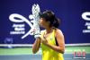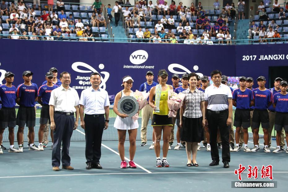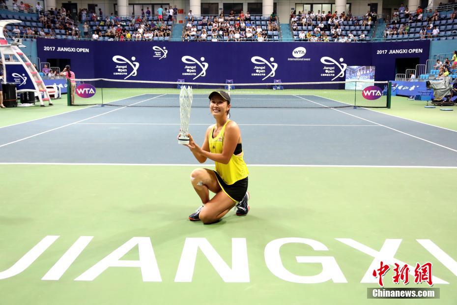 7月30日,奪得冠軍的中國金花彭帥站在寫有“JIANGXI”的字母前留影。當天,2017江西網(wǎng)球公開賽決賽在南昌打響,中國女網(wǎng)名將彭帥以6比3、6比2橫掃日本選手日比野菜緒,奪得賽事冠軍,同時這也是她第二次在南昌登頂。 中新社記者 劉占昆 攝 -
