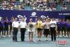 7月30日,主辦方為獲得冠、亞軍的中國選手彭帥(右三)、日本選手日比野菜緒頒獎。當天,2017江西網(wǎng)球公開賽決賽在南昌打響,中國女網(wǎng)名將彭帥以6比3、6比2橫掃日本選手日比野菜緒,奪得賽事冠軍,同時這也是她第二次在南昌登頂。 中新社記者 劉占昆 攝