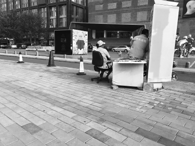 在黃木廠路北段與百子灣路的交叉路口處,路邊擺放著禁止停車的標(biāo)志和“違章停車拍照處罰”的牌子。在距離路口幾十米外的今日美術(shù)館北側(cè)路邊,有一男一女躲在樹(shù)蔭下乘涼,男子身穿藍(lán)色制服,背后有“停車收費(fèi)”字樣,女子身穿橙色上衣,背后同樣也印有“停車管理”字樣,在他們身邊擺著幾個(gè)黑色的錐桶。不遠(yuǎn)處路邊有一塊禁止車輛臨時(shí)、長(zhǎng)期停放的交通標(biāo)志牌,下面有“百子灣路”幾個(gè)字,然而標(biāo)志牌中央的紅色交叉線被抹去了,但痕跡仍在,牌子旁邊的人行道上擺著兩張椅子。這條路的北側(cè)同樣有一塊禁止停車的標(biāo)志牌,路南側(cè)停滿了車,地面上劃有停車線。