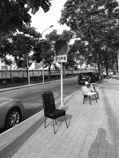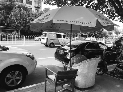 順著停車帶往東走,會(huì)看到身穿橙色制服的幾名男子騎著電動(dòng)自行車來(lái)回巡視,每當(dāng)有車從停車位開(kāi)走,或者準(zhǔn)備停車時(shí),他們就會(huì)上前,從車的前擋風(fēng)玻璃取下小紙條,按上面的時(shí)間收錢。在這條路中段的人行道上,立著一把黃色的大傘,傘下面擺著兩把椅子,一名身穿淺藍(lán)色上衣的男子正在路邊喝水,所穿的衣服后背上印著“停車管理”四個(gè)字。他告訴記者:“這條路兩側(cè)路邊停車都是要收費(fèi)的,第一個(gè)小時(shí)6元,第二個(gè)小時(shí)9元!彼f(shuō)因同村的老鄉(xiāng)有事,所以臨時(shí)來(lái)替他上幾天班。他指了指頭頂?shù)恼陉?yáng)傘說(shuō),這把傘和沙發(fā)都是路邊一家金融公司提供的。