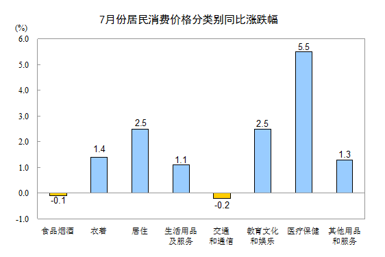 7月份,其他七大類價(jià)格同比六漲一降。其中,醫(yī)療保健價(jià)格上漲5.5%,居住、教育文化和娛樂(lè)價(jià)格均上漲2.5%,衣著、其他用品和服務(wù)、生活用品及服務(wù)價(jià)格分別上漲1.4%、1.3%和1.1%;交通和通信價(jià)格下降0.2%。