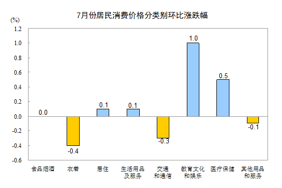 7月份,其他七大類價(jià)格環(huán)比四漲三降。其中,教育文化和娛樂(lè)、醫(yī)療保健價(jià)格分別上漲1.0%和0.5%,居住、生活用品及服務(wù)價(jià)格均上漲0.1%;衣著、交通和通信、其他用品和服務(wù)價(jià)格分別下降0.4%、0.3%和0.1%。