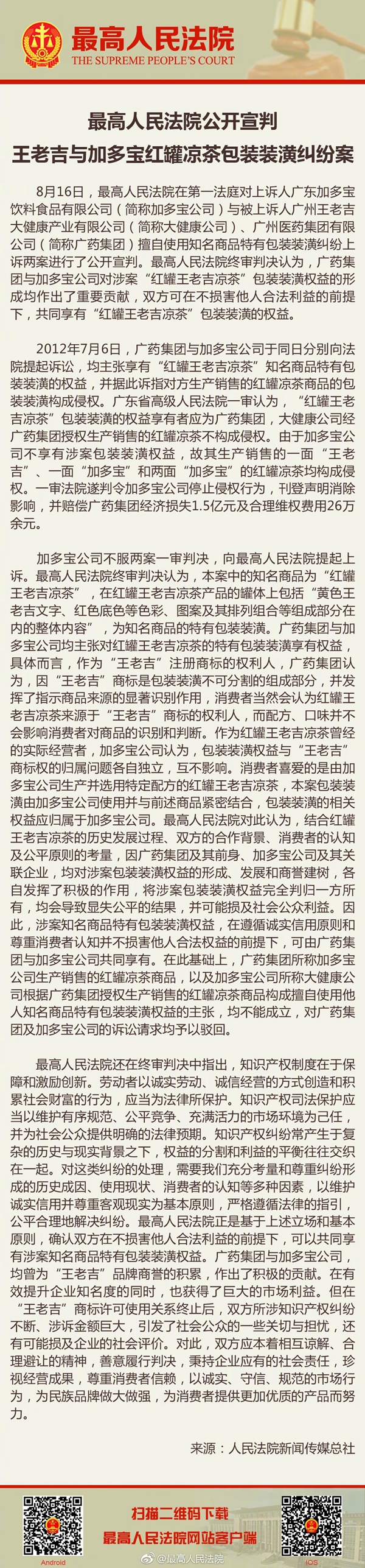 最高人民法院今天在第一法庭對(duì)上訴人廣東加多寶飲料食品有限公司(簡(jiǎn)稱加多寶公司)與被上訴人廣州王老吉大健康產(chǎn)業(yè)有限公司(簡(jiǎn)稱大健康公司)、廣州醫(yī)藥集團(tuán)有限公司(簡(jiǎn)稱廣藥集團(tuán))擅自使用知名商品特有包裝裝潢糾紛上訴兩案進(jìn)行了公開宣判。最高人民法院終審判決認(rèn)為,廣藥集團(tuán)與加多寶公司對(duì)涉案“紅罐王老吉涼茶”包裝裝潢權(quán)益的形成均作出了重要貢獻(xiàn),雙方可在不損害他人合法利益的前提下,共同享有“紅罐王老吉涼茶”包裝裝潢的權(quán)益。(新民晚報(bào) 潘子璇)