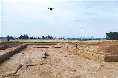 考古工作人員在二里頭遺址宮殿區(qū)發(fā)掘現(xiàn)場進行航拍。新華社發(fā)