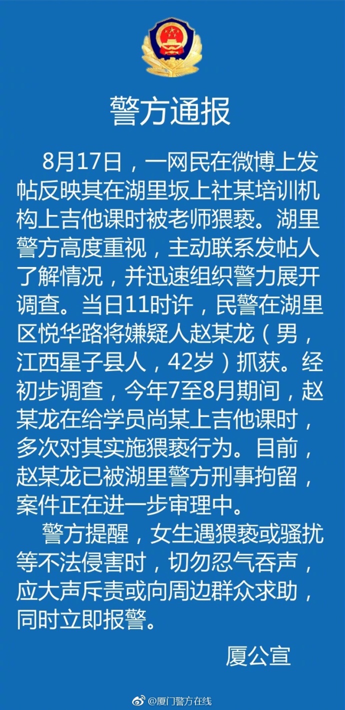 通報(bào)顯示,8月17日,一網(wǎng)民在微博上發(fā)帖反映其在湖里坂上社某培訓(xùn)機(jī)構(gòu)上吉他課時(shí)被老師猥褻。廈門湖里警方高度重視,主動(dòng)聯(lián)系發(fā)帖人了解情況,并迅速組織警力展開調(diào)查。
