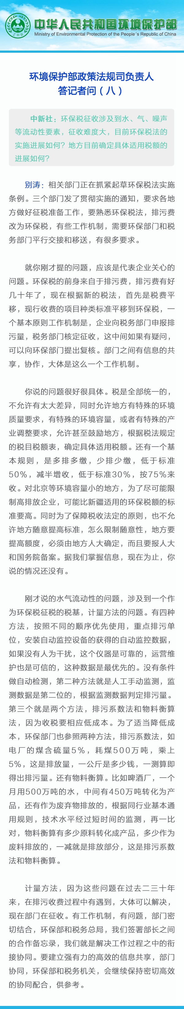 有記者問(wèn):環(huán)保稅征收涉及到水、氣、噪聲等流動(dòng)性要素,征收難度大,目前環(huán)保稅法的實(shí)施進(jìn)展如何?地方目前確定具體適用稅額的進(jìn)展如何?