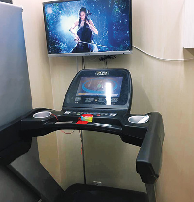 共享運動倉內(nèi)的跑步機和電視。本報記者 劉 峣攝