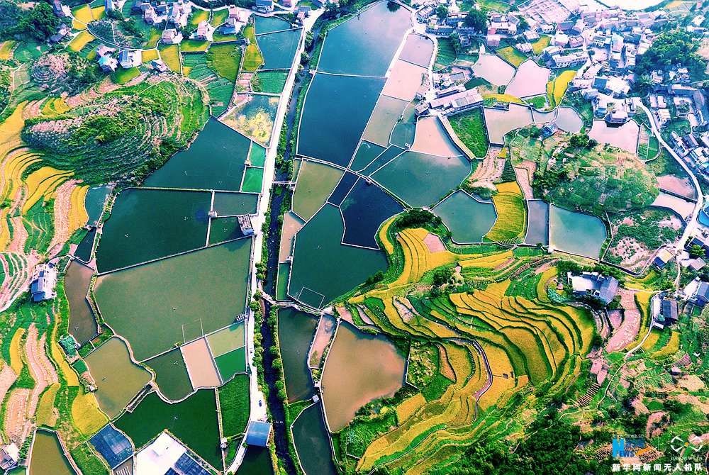 立秋之后,南方水稻逐漸成熟,金黃色的稻田呈現(xiàn)出別樣美景。在重慶市萬(wàn)盛經(jīng)開(kāi)區(qū)南桐鎮(zhèn)金龍村,金黃色稻田與魚(yú)塘相互映襯,田野的線條在稻田中穿梭,美不勝收。從空中俯瞰,猶如天然“調(diào)色板”,色彩斑斕。新華網(wǎng)發(fā) 曹永龍攝